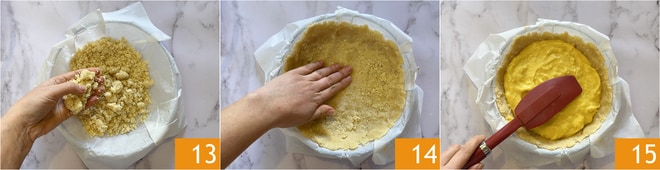 Forre com papel manteiga uma forma de 24 cm de diâmetro. Despeje pouco mais da metade da massa esfarelada 13. Distribua no fundo e nas bordas. Compacte a massa com as mãos 14. Despeje o creme preparado, nivelando-o com uma espátula, sem ultrapassar as bordas da massa 15.