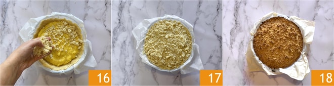 Cubra a superfície da farofinha com as migalhas restantes da massa 16 17. Asse o doce em forno estático, já aquecido, a 180° por 1 hora. Após 40 minutos, se a superfície escurecer muito, cubra o doce com uma folha de papel alumínio. Após o cozimento, retire a farofinha com creme do forno e deixe esfriar antes de servir 18.