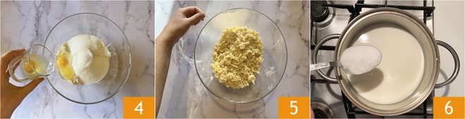 os ovos 4, incorpore-os e esfarele novamente a massa com os dedos. Cubra a tigela com filme plástico 5 e deixe descansar na geladeira por 1 hora. Enquanto isso, prepare o creme de confeiteiro: despeje o leite em uma panela, adicione o açúcar 6,