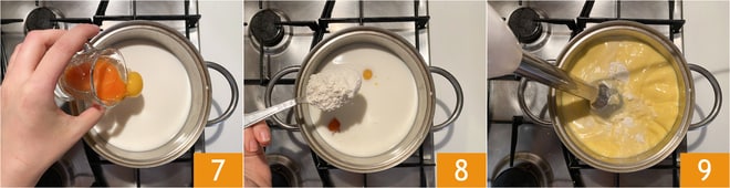 as gemas 7 e a farinha 8. Bata os ingredientes com um mixer de mão para misturá-los 9.