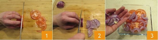 Para preparar a feta assada, primeiro pré-aqueça o forno a 180° em modo estático, depois prepare os ingredientes que irá precisar: lave os tomates, remova a parte com o talo e corte-os em rodelas finas 1. Descasque a cebola roxa, divida-a ao meio longitudinalmente e corte-a transversalmente em fatias finas 2. Coloque as fatias de tomate e de cebola em uma tigela 3,