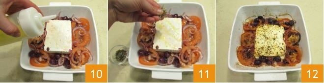 Para finalizar, tempere com o azeite restante 10 e uma pitada de folhas de orégano 11, depois asse no forno estático pré-aquecido a 180° por cerca de uma hora. Após esse tempo, sua feta assada estará pronta para ser servida 12!