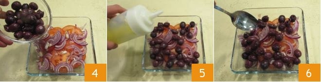 em seguida, adicione as azeitonas pretas 4, metade da dose de azeite 5 e uma pitada de sal e misture bem todos os ingredientes 6.