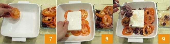 Agora pegue uma assadeira de cerâmica (usamos uma assadeira quadrada de 18 cm de lado) e forre a base com as fatias de tomate 7. Coloque a feta inteira no centro 8 e distribua o restante do tempero ao redor dos lados 9.