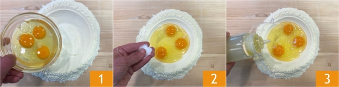 Para preparar os tagliolini com alcachofras e camarões, primeiro coloque a farinha em uma fonte e adicione os ovos no centro 1, depois acrescente uma pitada de sal 2 e uma colher de sopa de óleo 3.