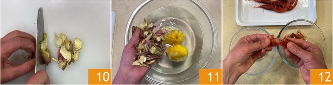 Corte as alcachofras em fatias 10 e vá imergindo-as em água acidulada 11. Para a Como limpar os camarões, primeiro retire a cabeça 12.