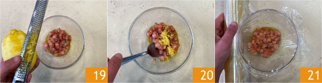 Adicione as raspas de limão 19 e misture 20. Cubra com filme plástico 21 e deixe marinar na geladeira até o momento de usar.
