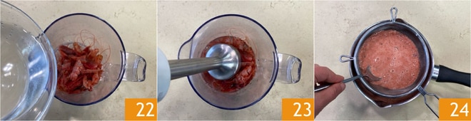 Coloque as cabeças e as cascas em um recipiente, adicione um pouco de água 22 e triture com um mixer de imersão 23. Coe o molho em uma panela através de uma peneira 24.