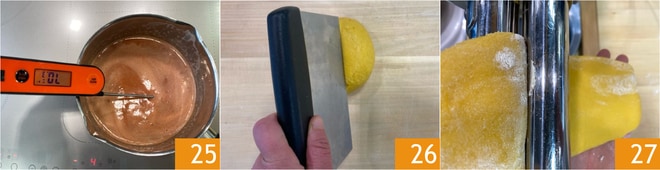 Aqueça a mistura até 70°C e reserve 25. Após o tempo de descanso da massa, pegue a massa e divida ao meio 26. Passe a primeira porção uma vez na laminadora 27, tendo o cuidado de manter a outra envolta em filme plástico para evitar que resseque.