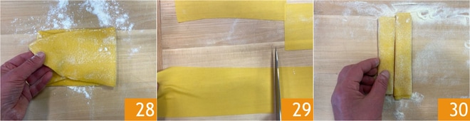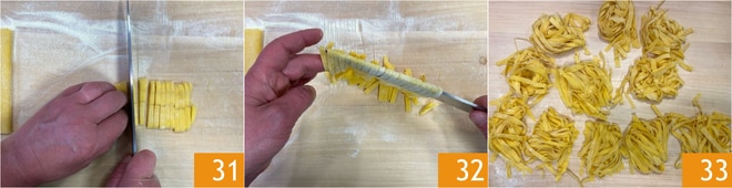 Corte os cilindros em tiras com largura de 4-5 mm 31. Desenrole as fettuccine 32 e enrole-as várias vezes nos dedos até formar ninhos. Reserve 33.