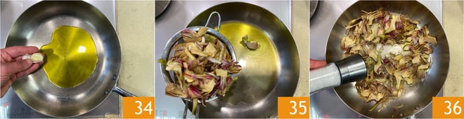 Em uma frigideira, aqueça um fio de óleo, adicione o alho 34 e refogue por um minuto. Junte as alcachofras bem escorridas 35 e ajuste o sal 36 e a pimenta. Salteie por 5-7 minutos em fogo médio-alto.
