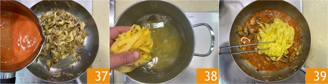 Retire o alho, adicione o molho de camarão 37 e misture. Enquanto isso, cozinhe a massa em bastante água salgada por 2-3 minutos 38. Escorra as fettuccine diretamente na frigideira 39 e misture bem.