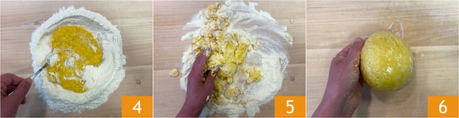 Incorpore a farinha aos poucos, primeiro ajudando-se com um garfo 4 e depois com as mãos 5 até obter uma massa lisa e homogênea. Envolva em filme plástico 6 e deixe descansar na geladeira por pelo menos 30 minutos.