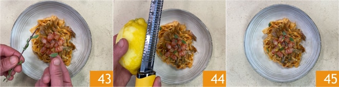 Decore com algumas folhas de manjerona a mais 43 e uma pitada de raspas de limão 44. Suas fettuccine com alcachofras e camarões estão prontas para ser servidas 45!
