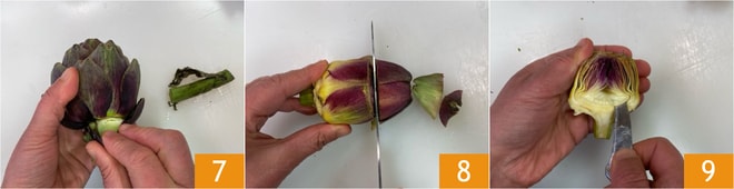 Enquanto isso, dedique-se à Como limpar alcachofras: elimine as folhas mais externas e duras 7, depois corte as pontas 8. Divida as alcachofras ao meio e elimine o miolo 9.