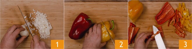 Para preparar as fettuccine com pimentões, primeiro pique a cebola 1, depois limpe os pimentões: remova a tampa 2, retire o talo com o caule, as sementes e as nervuras brancas 3.
