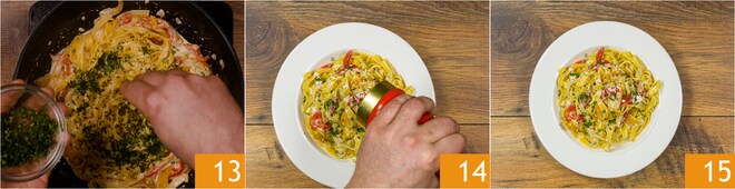 Complete com salsa fresca 13 e uma pitada de pimenta 14. Sirva imediatamente suas fettuccine com pimentões 15!