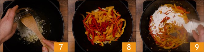 Adicione a cebola e refogue até amolecer 7. Quando estiver bem amolecida, junte os pimentões e cozinhe em fogo médio por 10-15 minutos 8. Tempere com sal, adicione o creme de leite 9 e finalize o cozimento do molho em fogo baixo.