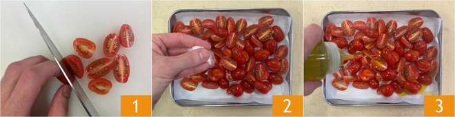 Para preparar o filé de bacalhau no vapor com tomates e alcaparras, primeiro divida os tomatinhos em 4 partes 1, depois distribua-os em uma assadeira forrada com papel manteiga. Tempere com sal 2 e azeite 3 e asse em forno ventilado pré-aquecido a 180°C por 40 minutos.
