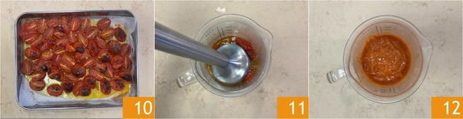 Quando os tomates estiverem cozidos 10, transfira metade deles para um copo e bata com um mixer de imersão 11 para obter um creme liso e homogêneo 12.