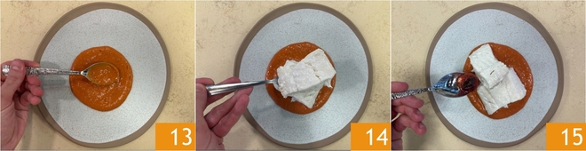 Você está pronto para empratar: espalhe o creme de tomates assados no fundo do prato 13, depois coloque por cima 2 pedaços de bacalhau 14 e decore com os tomatinhos inteiros reservados 15.