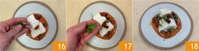 Finalmente adicione as alcaparras 16, as azeitonas taggiasche, algumas folhas de manjericão 17 e um fio de azeite. Seu filé de bacalhau no vapor com tomates e alcaparras está pronto para ser servido 18!