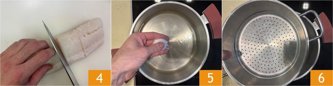 Enquanto isso, corte o filé de bacalhau em pedaços de 100 g cada 4. Salgue a água na panela a vapor 5, coloque o cesto por cima 6 e leve para ferver.