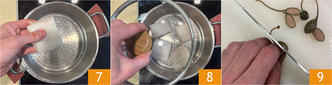 Coloque os pedaços de bacalhau no cesto 7, tampe 8 e cozinhe por 7 minutos. Após esse tempo, retire o bacalhau da panela a vapor e seque-o delicadamente com papel toalha para eliminar o excesso de água. Enquanto isso, divida as alcaparras ao meio 9.