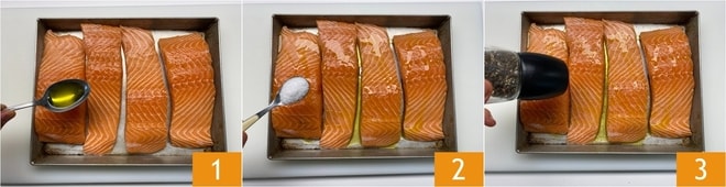 Para preparar o filé de salmão na frigideira, a primeira coisa a fazer é cuidar da marinada: coloque os filés em uma tigela e tempere-os com óleo 1, sal 2 e pimenta-do-reino moída na hora 3.