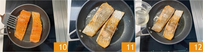 Cozinhe o salmão por 4 minutos de um lado, depois vire-o delicadamente 10. Cozinhe por mais um minuto 11 e adicione o vinho branco 12.