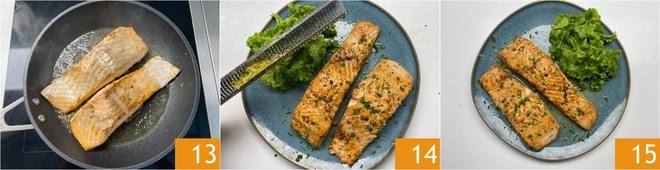 Deixe o álcool evaporar e cozinhe por mais 3 minutos 13. Transfira o salmão para um prato, decore com a salsa picada e a casca de limão ralada 14. Seu filé de salmão na frigideira está pronto para ser servido 15!
