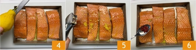 Adicione a casca de limão 4 e um dente de alho esmagado 5. Adicione também a pimenta rosa em grãos 6.