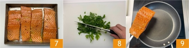 Massageie os filés com as mãos para uniformizar bem os sabores 7, depois cubra com filme plástico e deixe marinar na geladeira por uma hora. Neste ponto, pique finamente a salsa 8 e reserve. Em uma frigideira antiaderente bem quente, coloque os filés de salmão 9.