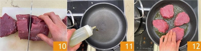 Enquanto isso, limpe o filé removendo a membrana externa e obtenha medalhões de 250 g 10, depois seque-os com papel toalha para absorver bem. Aqueça em uma frigideira grande um fio de azeite extra virgem em fogo médio-alto 11 e, quando estiver bem quente, coloque os medalhões 12.