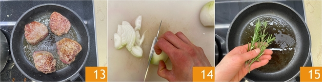 Doure-os por 2-3 minutos de cada lado até que se forme uma bela crosta 13, depois transfira-os para um prato e mantenha-os aquecidos. Agora limpe e fatie a cebola 14. Na mesma frigideira em que você dourou a carne, aqueça um fio de azeite com o alecrim 15.