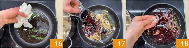 Adicione a cebola e refogue por alguns minutos 16, depois adicione o Amarone 17; deixe evaporar, salgue 18 e deixe reduzir por cerca de 15 minutos em fogo baixo.