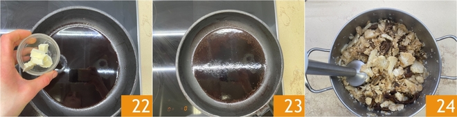 Coloque o fundo filtrado de volta na panela e continue cozinhando por mais 10 minutos, até que o volume tenha reduzido cerca de dois terços. Neste ponto, desligue o fogo e adicione a manteiga muito fria em cubos 22, girando a panela para derreter e emulsionar o molho até que fique brilhante e aveludado; reserve-o 23. Retome a couve-flor cozida com os cogumelos e bata no liquidificador de imersão 24.