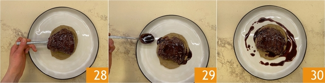 Coloque a carne por cima 28 e finalize com o molho de vinho 29. Sirva imediatamente o seu filé de boi ao Amarone 30!