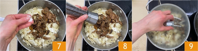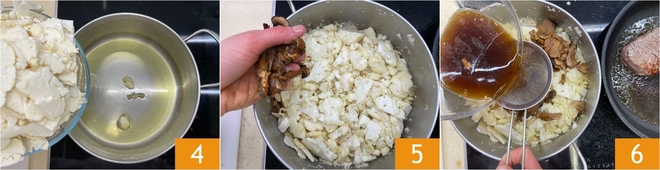 Adicione a couve-flor 4 e refogue brevemente. Retome os cogumelos amolecidos e acrescente-os à couve-flor 5, junto com a água de molho filtrada 6.