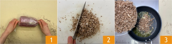 Para preparar o filé à Wellington, primeiro faça o Caldo de carne, tendo o cuidado de salgá-lo moderadamente. Elimine o excesso de gordura do filé mignon e depois envolva-o bem apertado com filme plástico 1. Deixe descansar na geladeira por 30 minutos. Enquanto isso, limpe os cogumelos e pique-os finamente com uma faca 2. Em uma frigideira, aqueça um fio de óleo, depois acrescente o alho e os cogumelos 3.