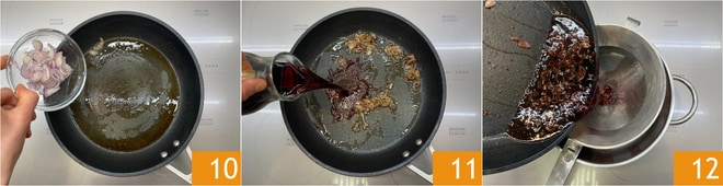Na mesma frigideira onde você cozinhou o filé, coloque a chalota picada finamente e enfarinhada 10. Refogue por alguns minutos, depois adicione o vinho tinto 11. Quando toda a parte alcoólica tiver evaporado, coe tudo através de uma peneira, recolhendo o líquido em uma panela 12.