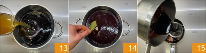Adicione o caldo de carne 13, uma folha de louro 14 e deixe reduzir no fogo para três quartos; você deve obter um molho que não seja muito líquido nem muito denso. Coe novamente 15.