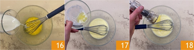 Agora dedique-se à preparação das crepes: em uma tigela, bata o ovo, depois adicione o leite 16 e a manteiga derretida e morna 17. Ajuste o sal e a pimenta 18.