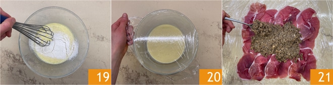 Adicione também a farinha 19 e misture com um batedor até obter uma massa homogênea e sem grumos. Cubra com filme plástico e deixe descansar na geladeira por 30 minutos 20. Estenda o presunto cru sobre uma folha de filme plástico, sobrepondo ligeiramente as fatias para formar um retângulo, depois distribua uma camada de cogumelos por cima 21.