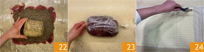 Coloque o filé mignon sobre os cogumelos 22, depois enrole as fatias de presunto ao redor da carne, envolvendo-o bem apertado no filme plástico. Feche bem como um bombom 23 e coloque na geladeira por 30 minutos. Enquanto isso, corte a massa folhada em tiras de 2 cm de largura 24.