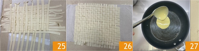 Comece a trançar as tiras 25 até formar um padrão semelhante ao de uma cesta de vime 26 e reserve. Pegue a massa para as crepes e misture para ativá-la. Unte com manteiga uma frigideira antiaderente e, quando estiver bem quente, despeje uma concha de massa no centro. Gire a frigideira para cobrir todo o fundo com a massa 27.