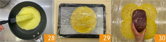 Cozinhe por um minuto em fogo médio-baixo; quando notar que as bordas começam a se soltar, vire a crepe 28 e cozinhe do outro lado. Repita o mesmo procedimento até terminar a massa, com essas quantidades, você deve obter 4 crepes. Empilhe-as em uma assadeira coberta com papel manteiga e cubra com filme plástico 29, assim elas se manterão macias até o momento de usar. Quando o tempo de descanso do filé terminar, disponha as crepes sobre uma folha de filme plástico, sobrepondo-as ligeiramente, depois coloque o filé no centro 30.