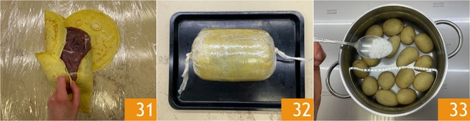 Envolva-o com as crepes 31, depois enrole tudo com o filme plástico, fechando como um bombom 32. Deixe descansar na geladeira por 30 minutos. Enquanto isso, dedique-se à preparação do purê de batatas: cozinhe as batatas em água fria salgada 33, levará cerca de 30-40 minutos, dependendo do tamanho. Enquanto isso, aqueça o leite em uma panela à parte.