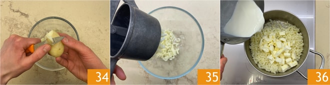 Depois de verificar o cozimento com um garfo, escorra as batatas e deixe esfriar por alguns minutos, depois retire a casca 34. Amasse as batatas 35 e transfira para uma panela, depois adicione a manteiga e o leite quente 36.