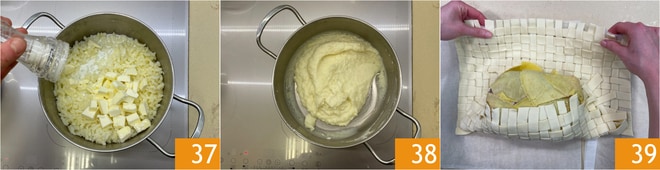 Ajuste o sal 37 e cozinhe em fogo baixo, mexendo continuamente, até obter uma consistência lisa e homogênea 38. Pegue o filé na geladeira, coloque-o no centro do trançado de massa folhada e envolva delicadamente 39.
